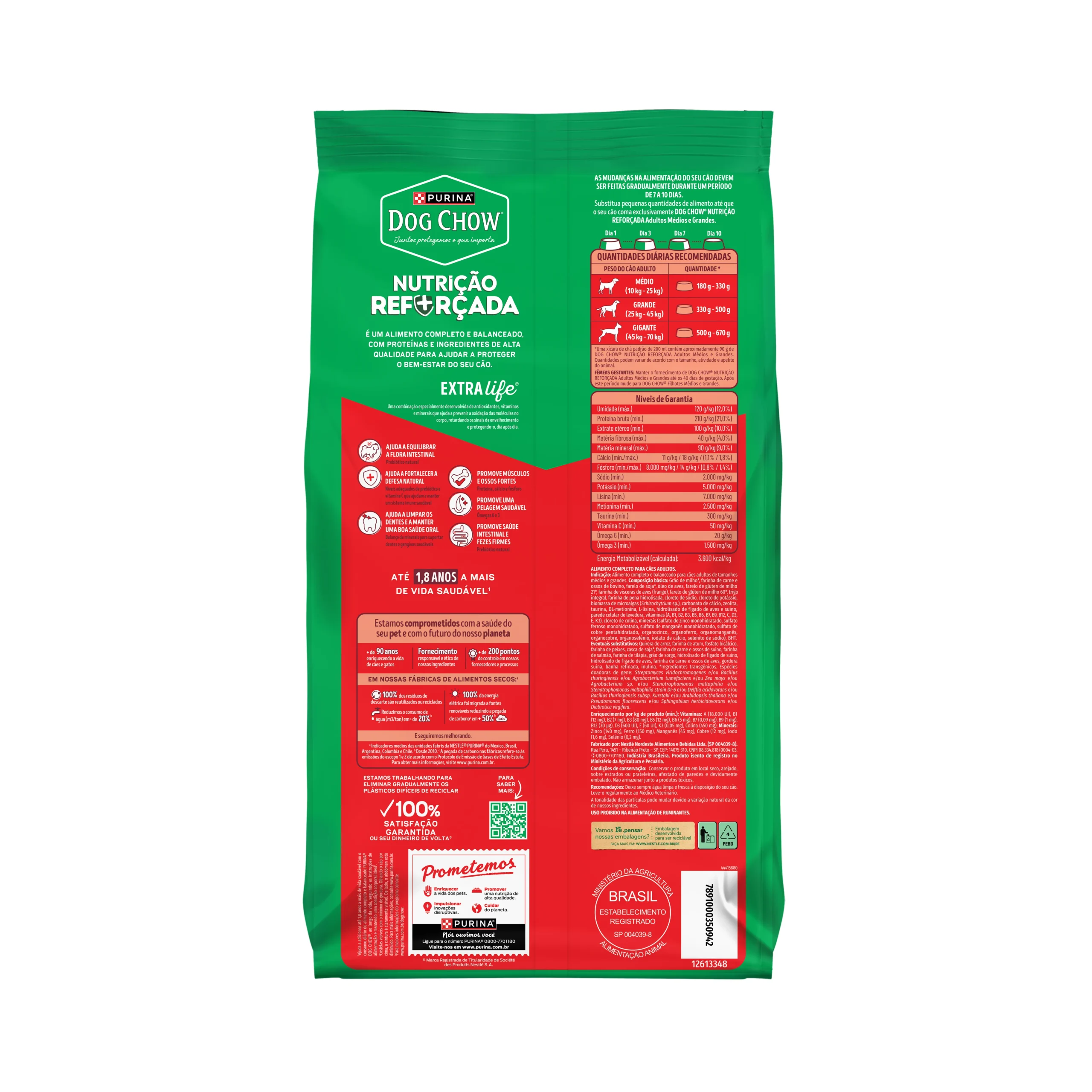 NOVO Dog Chow® Nutrição Reforçada é um alimento com EXTRALIFE®, completo e balanceado, com proteínas e ingredientes de alta qualidade para ajudar a proteger o bem-estar do seu cão. Formulado especialmente para cães adultos de raças médias, grandes e gigantes, ajuda a equilibrar a flora intestinal, fortalecer as defesas naturais e manter a saúde oral, contribuindo para uma vida mais longa e saudável. Juntos protegemos o que importa.