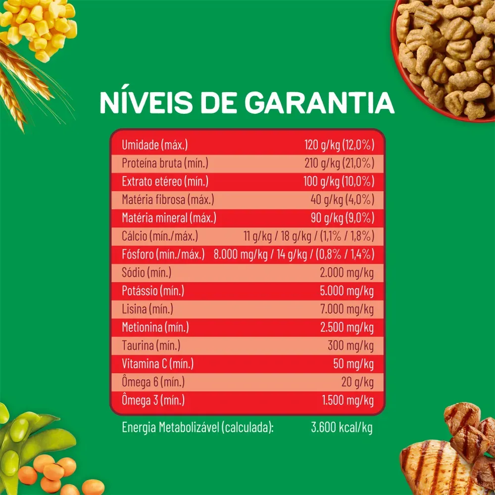 Grão de milho*, farinha de carne e ossos de bovino, farelo de soja*, óleo de aves, farelo de glúten de milho 21*, farinha de vísceras de aves (frango), farelo de glúten de milho 60*, trigo integral, farinha de pena hidrolisada, cloreto de sódio, cloreto de potássio, biomassa de microalgas (Schizochytrium sp.), carbonato de cálcio, zeolita, taurina, DL-metionina, L-lisina, hidrolisado de fígado de aves e suíno, parede celular de levedura, vitaminas (A, B1, B2, B3, B5, B6, B7, B9, B12, C, D3, E, K3), cloreto de colina, minerais (sulfato de zinco monohidratado, sulfato ferroso monohidratado, sulfato de manganês monohidratado, sulfato de cobre pentahidratado, organozinco, organoferro, organomanganês, organocobre, organoselênio, iodato de cálcio, selenito de sódio), BHT.