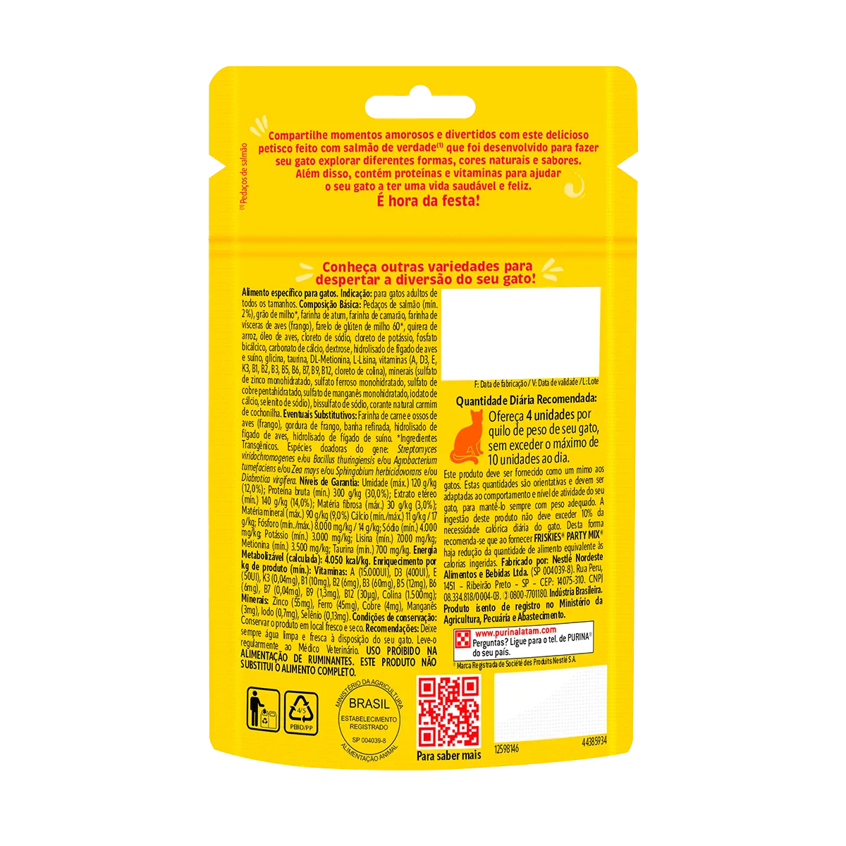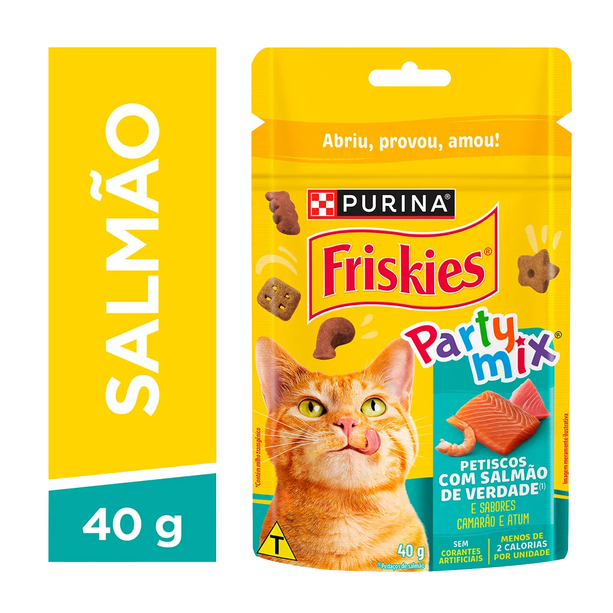 É hora da festa! PURINA FRISKIES® PARTY MIX® Salmão é um delicioso petisco feito com pedaços de salmão de verdade¹, desenvolvido para fazer seu gato explorar diferentes formas, cores naturais e sabores, compartilhando momentos amorosos e divertidos com você. Além disso, contém proteínas e vitaminas para ajudar o seu gato a ter uma vida saudável e feliz. ¹Pedaços de Salmão.