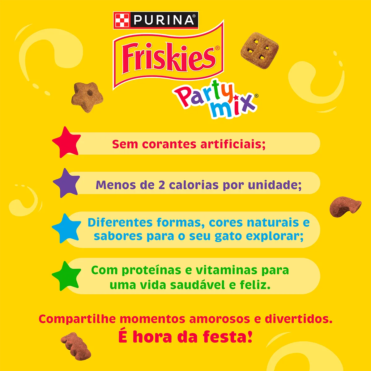 - Importante: Este produto não substitui o alimento completo. A ingestão deste petisco não deve exceder 10% da necessidade calórica diária do gato. Ao oferecer FRISKIES® PARTY MIX®, reduza a quantidade do alimento principal proporcionalmente às calorias do petisco.