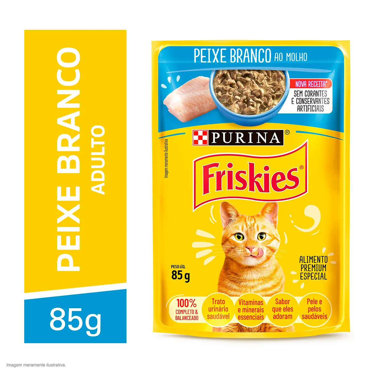 FRISKIES® Peixe Branco ao Molho é um alimento úmido com a deliciosa e saudável fórmula sem conservantes que os gatos adoram. É uma refeição saborosa, 100% completa e balanceada, feita de pedaços suculentos em um molho delicioso, sem corantes e conservantes artificiais (nova receita com merluza). Inclua o alimento úmido nas refeições do seu gato pelo menos 1 vez ao dia para ajudá-lo a se manter saudável e hidratado.