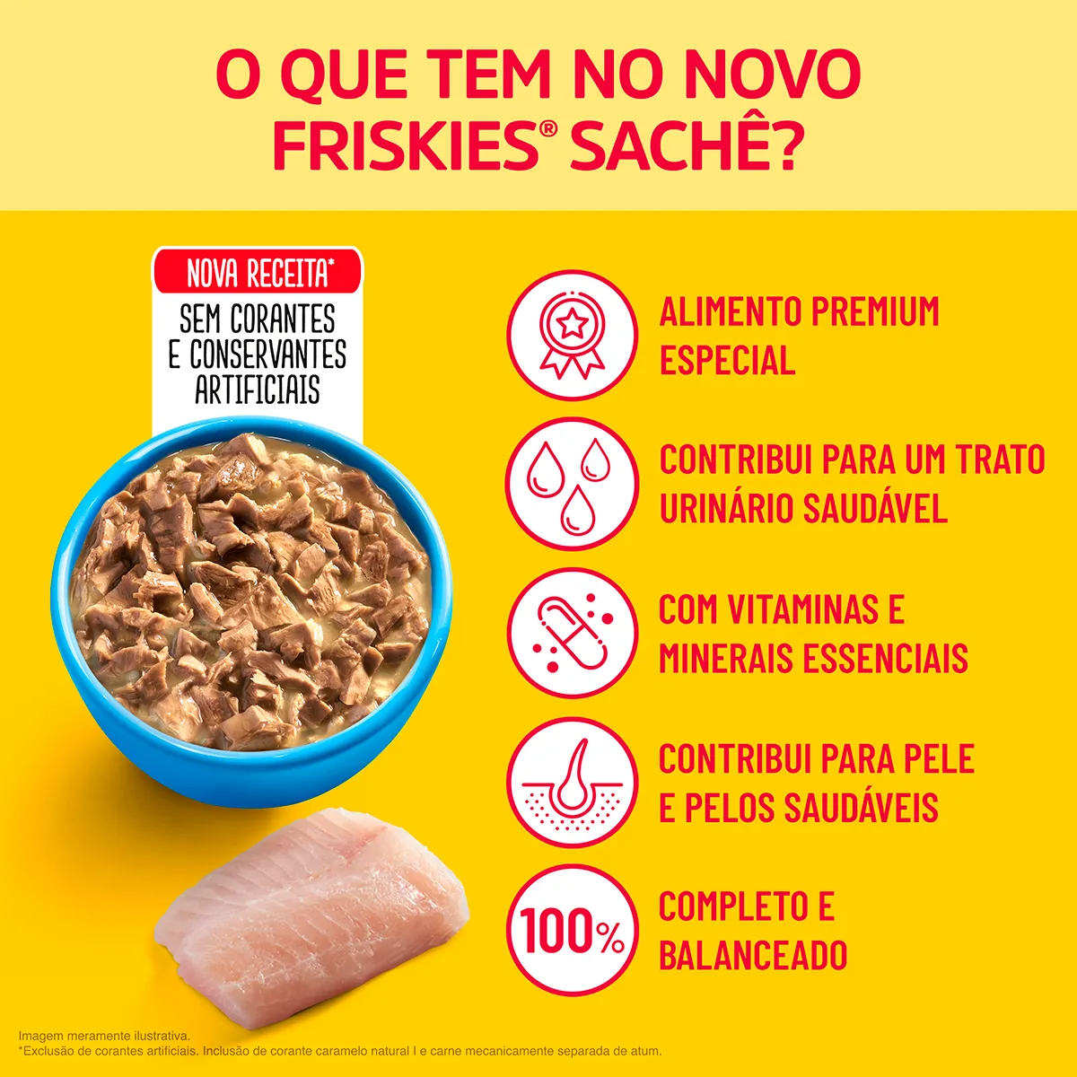Merluza (mín. 1%), carne mecanicamente separada de frango, fígado de suíno, glúten de trigo, proteína concentrada de soja, amido de milho, dextrose, fosfato bicálcico, cloreto de sódio, cloreto de potássio, carbonato de cálcio, água, taurina, glicina, vitaminas (A, D3, E, K3, B1, B2, B3, B5, B6, B7, B9, B12, cloreto de colina), minerais (sulfato de manganês monohidratado, sulfato ferroso monohidratado, iodato de cálcio, sulfato de cobre pentahidratado, sulfato de zinco monohidratado, selenito de sódio, proteinato de cobre, proteinato de ferro, proteinato de manganês, proteinato de selênio, proteinato de zinco).