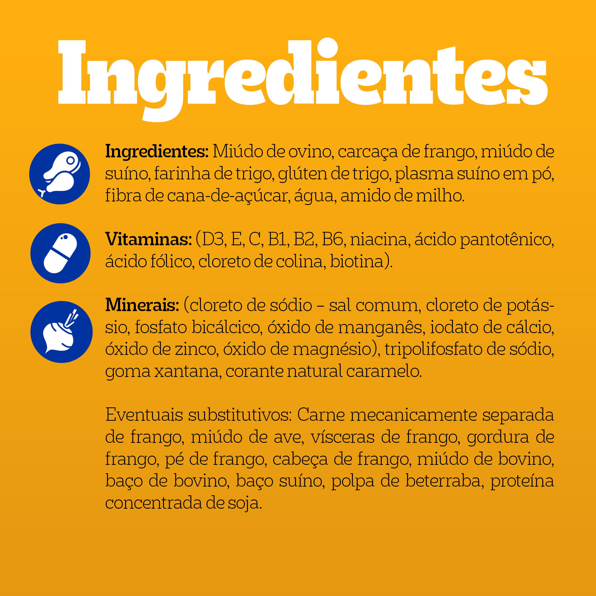 Miúdos de bovinos, carcaça de frango, miúdos de suínos, farinha de trigo, glúten de trigo, plasma sanguíneo desidratado de suíno, polpa desidratada de beterraba, água, minerais (cloreto de sódio, cloreto de potássio, fosfato bicálcico, óxido de magnésio, óxido de manganês, iodato de cálcio, óxido de zinco), vitaminas (D3, E, C, B1, B2, B6, niacina (ácido nicotínico), ácido pantotênico, ácido fólico, cloreto de colina, biotina), tripolifosfato de sódio, goma xantana, caramelo IV.