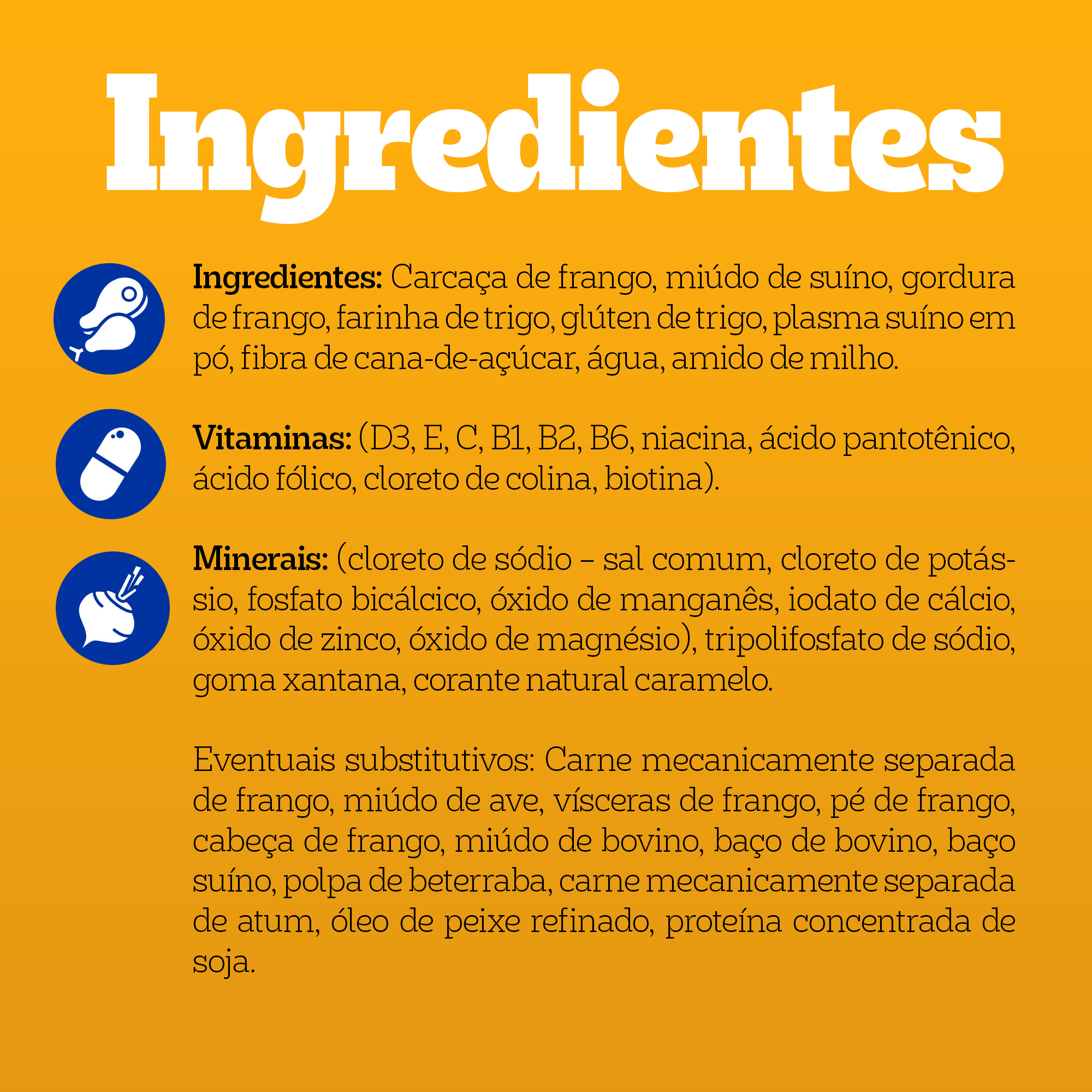 Carcaça de frango, miúdos de suínos, farinha de trigo, glúten de trigo, plasma sanguíneo desidratado de suíno, polpa desidratada de beterraba, água, minerais (cloreto de sódio, cloreto de potássio, fosfato bicálcico, óxido de magnésio, óxido de manganês, iodato de cálcio, óxido de zinco), vitaminas (D3, E, C, B1, B2, B6, niacina (ácido nicotínico), ácido pantotênico, ácido fólico, cloreto de colina, biotina), tripolifosfato de sódio, goma xantana, caramelo IV.