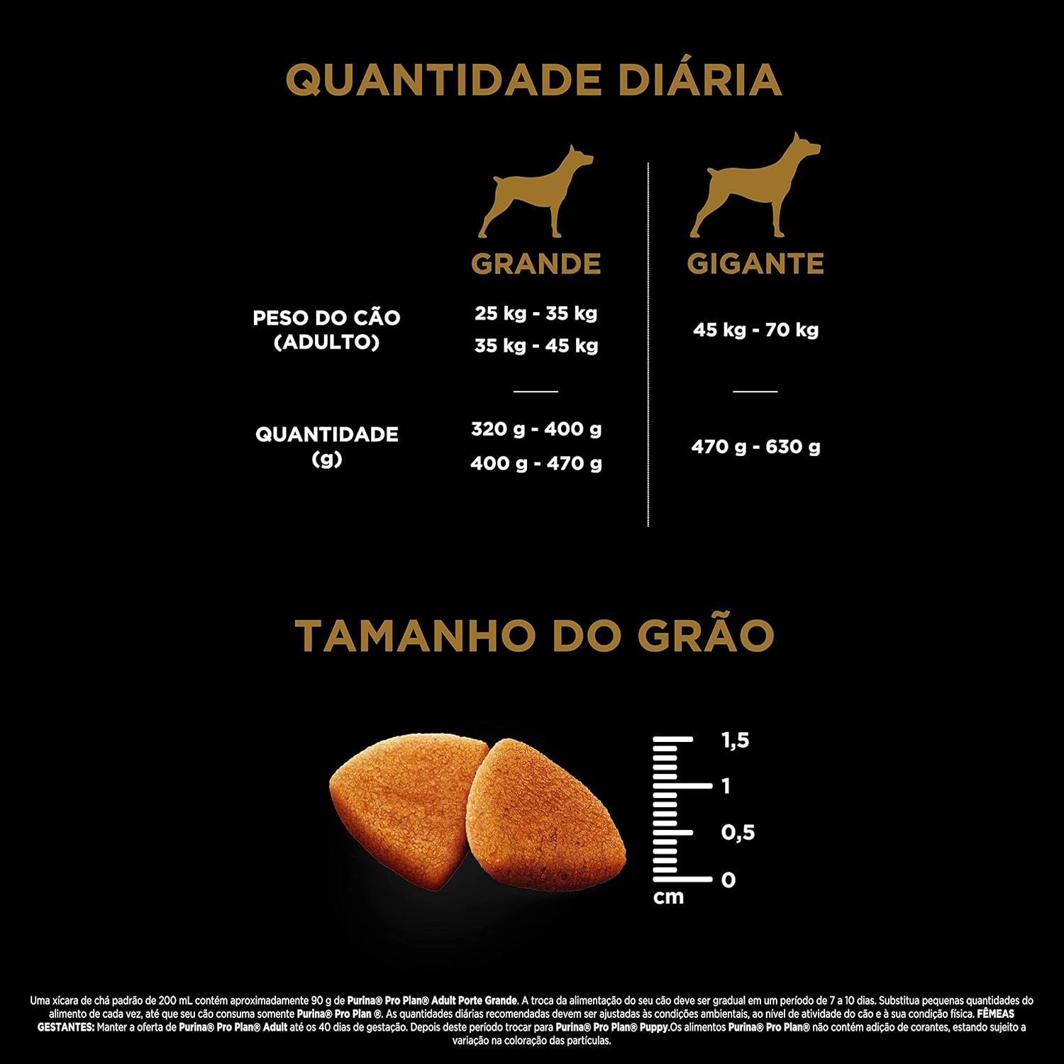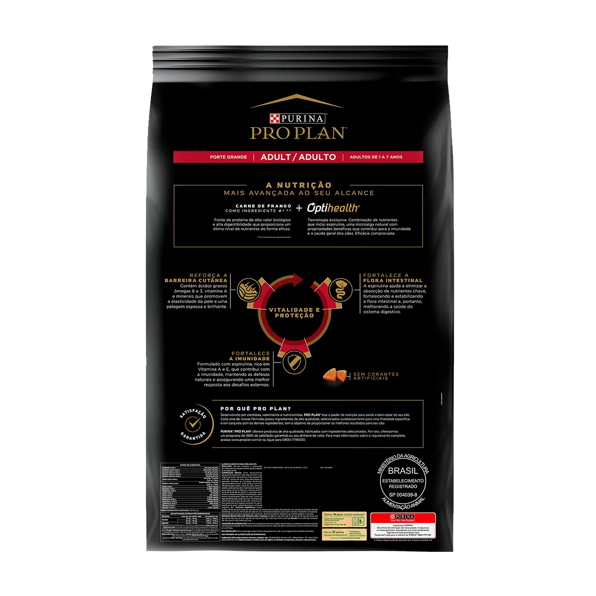 PRO PLAN® Adulto Porte Grande e Gigante é um alimento Super Premium 100% completo e balanceado, formulado especificamente para cães adultos de porte grande e gigante com atividade normal. Elaborado com carne de frango e a tecnologia exclusiva OPTIHEALTH®, uma combinação de nutrientes que inclui espirulina, uma microalga natural com propriedades benéficas que contribui para a imunidade e a saúde geral dos cães. Eficácia comprovada para vitalidade e proteção.