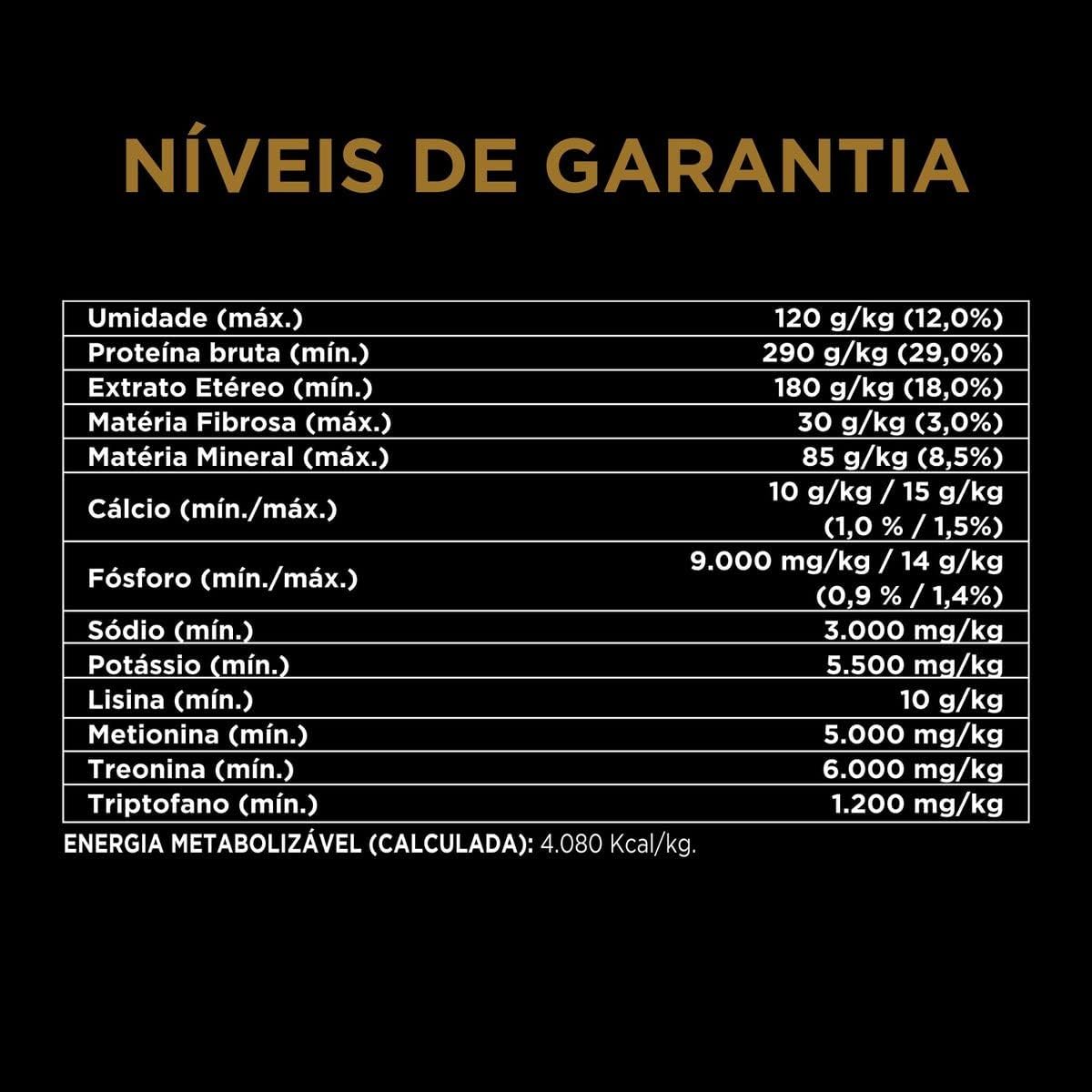 Carne mecanicamente separada de frango (mín. 19%), grão de milho*, trigo integral, farinha de vísceras de aves, farinha de peixes, farinha de atum, farelo de glúten de milho 60*, quirera de arroz, polpa de beterraba, gordura suína, óleo refinado de peixe, zeólita, parede celular de levedura, cloreto de sódio, cloreto de potássio, fosfato bicálcico, hidrolisado de fígado de aves e suíno, colostro bovino em pó (mín. 0,1%), L-Lisina, DL-metionina, L-treonina, L-triptofano, vitaminas (A, D3, E, K3, B1, B2, B3, B5, B6, B7, B9, B12, C, cloreto de colina), minerais (sulfato de manganês monohidratado, sulfato ferroso monohidratado, sulfato de cobre pentahidratado, sulfato de zinco monohidratado, organocobre, organoferro, organomanganês, organoselênio, organozinco, iodato de cálcio selenito de sódio), butirato de cálcio, sorbato de potássio, sulfato de magnésio, BHT.