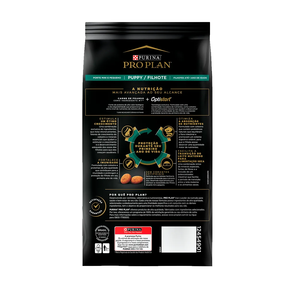 PRO PLAN® Filhote Minis e Pequenos é um alimento Super Premium 100% completo e balanceado, formulado especificamente para cães filhotes de porte mini e pequeno, bem como fêmeas gestantes ou lactantes. Elaborado com carne de frango como primeiro ingrediente e a tecnologia exclusiva OPTISTART®, que contém uma combinação inovadora de nutrientes, como colostro rico em anticorpos naturais. Esta fórmula ajuda a desenvolver e fortalecer a imunidade do filhote, estendendo a proteção durante seu primeiro ano de vida.