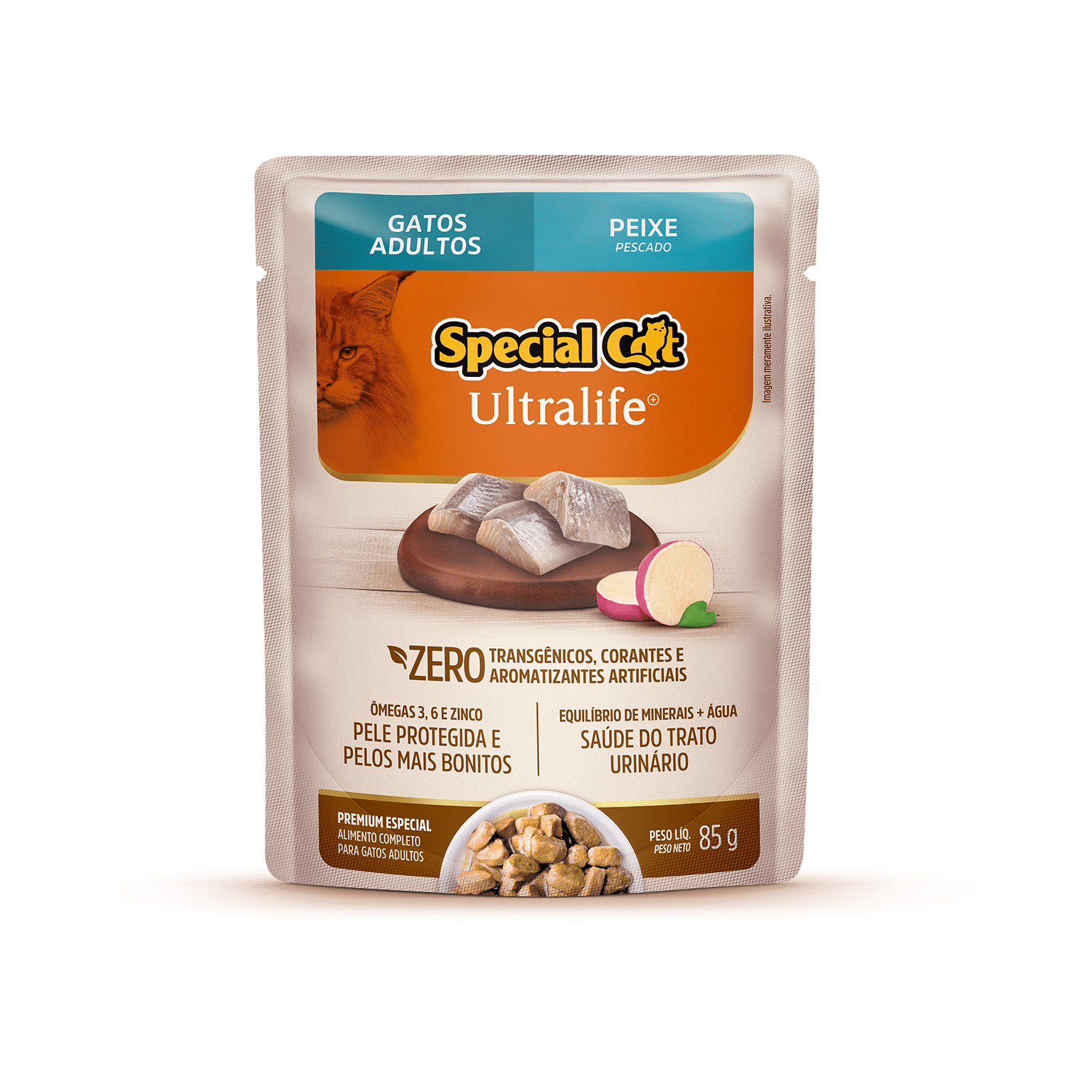 O Sachê Special Cat Ultralife para Gatos Adultos sabor Peixe é um alimento úmido completo e balanceado, desenvolvido por veterinários para a manutenção da saúde de gatos na fase adulta. Feito com pedaços macios e suculentos, oferece alta palatabilidade e ajuda a manter o felino hidratado.